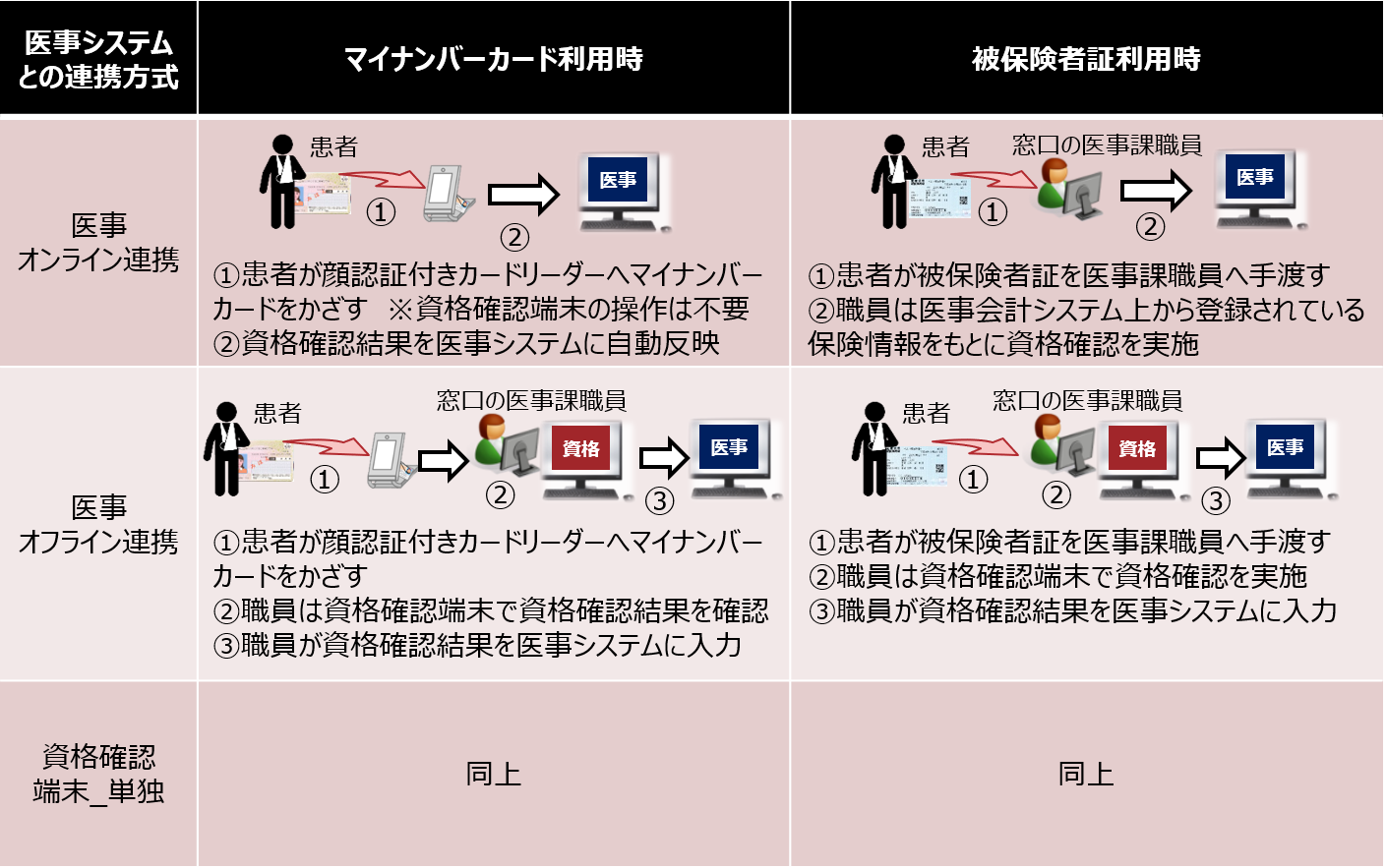 オンライン資格確認とは、従来、受付で健康保険証を受け取り、保険証記号番号等を医療機関システムに入力する必要がありましたが、マイナンバーカードの場合は 最新の保険資格を自動的に医療機関システムで取り込むことができ、また保険証でも、最小限の入力は必要ですが、有効であれば同様に資格情報を取り込むことができる仕組みです。これまでより効率的に、より安全に資格確認を行うことができます。
