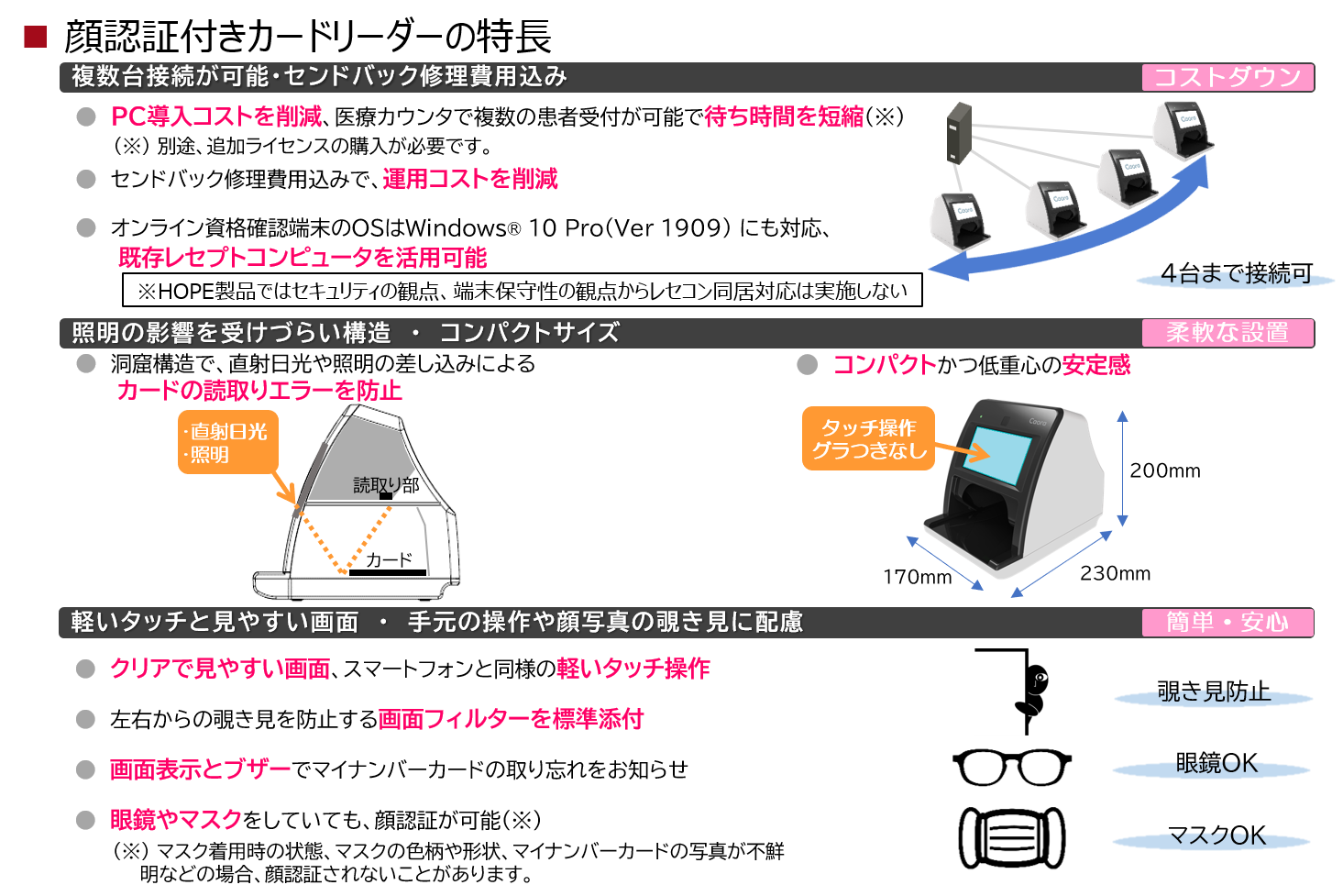 非接触環境が求められる医療現場における窓口業務の負荷軽減にお役立ていただける製品となっています。