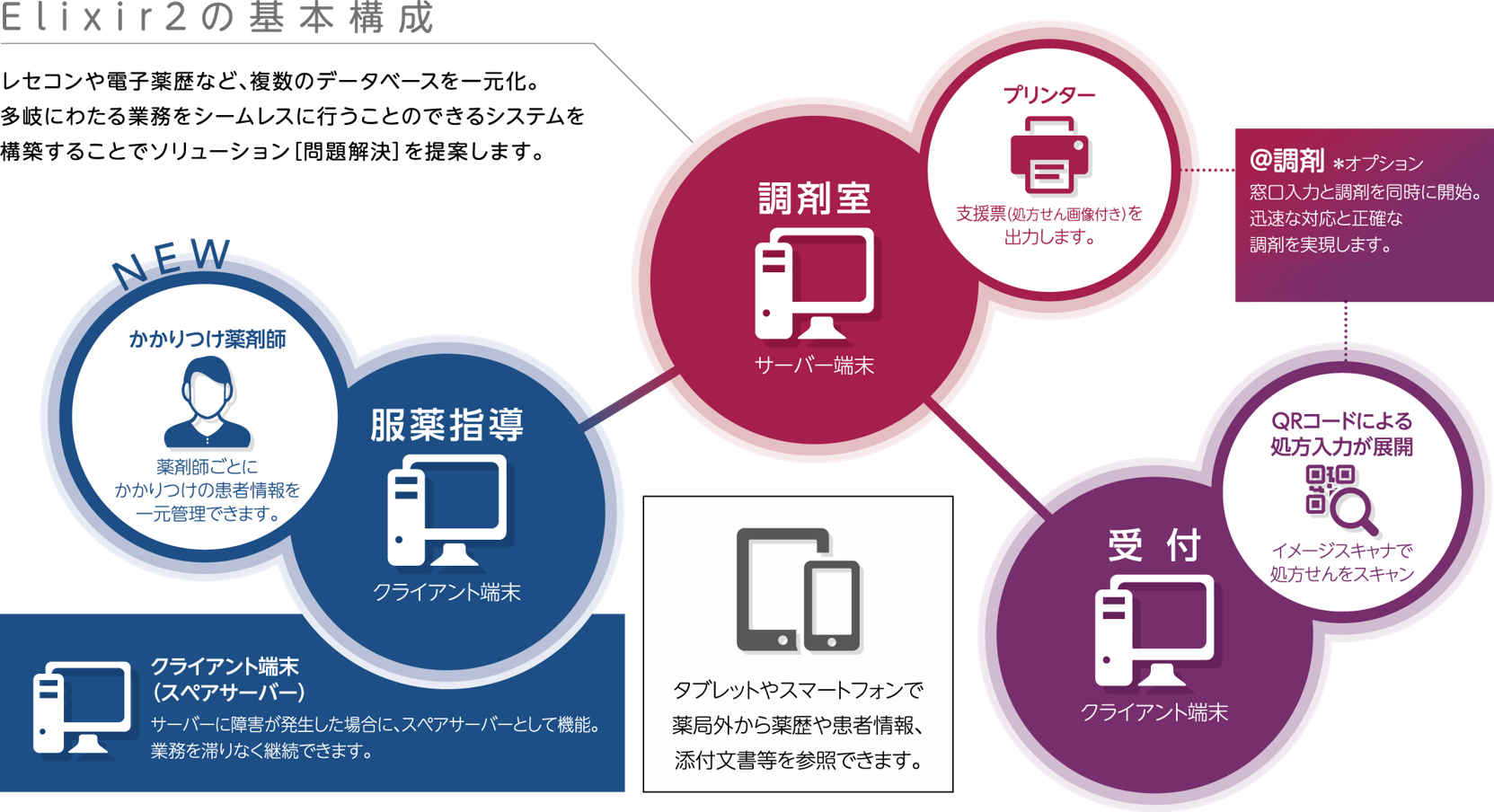 ElixirのDNAを引き継いだElixir2。シンプルかつ使いやすさはそのままに、さらに「見える」システムへ生まれ変わりました。レセコンから電子薬歴、経営管理まで保険薬局にかかわる業務を網羅し、複雑なデータをひとまとめに管理。多岐にわたる業務をシームレスに行うことのできるシステムを構築することでソリューション[問題解決]を提案します。